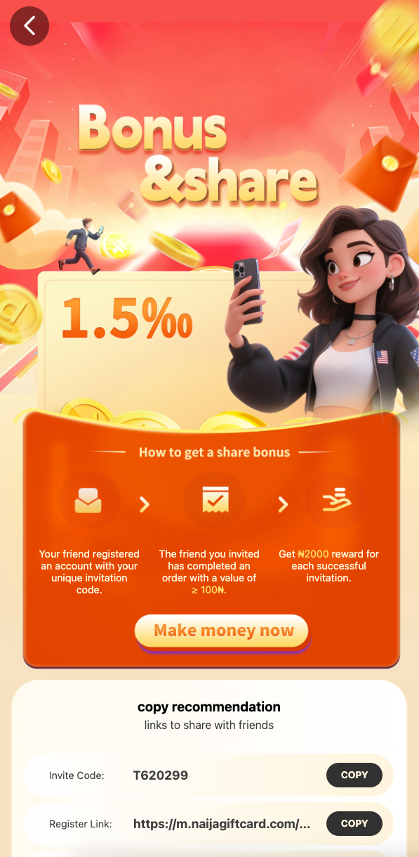 Invite a friend to register and complete a transaction on the app, and the inviter will receive ₦2,000. Afterwards, for every transaction made by the friend, the inviter will receive a reward of 1.5‰ of the total transaction amount.