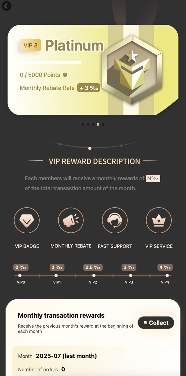 Each user will receive a monthly rebate of N ‰ of the total transaction amount for that month. (vip1: 2‰, vip2: 2.5‰, vip3: 3‰, vip4: 4‰)